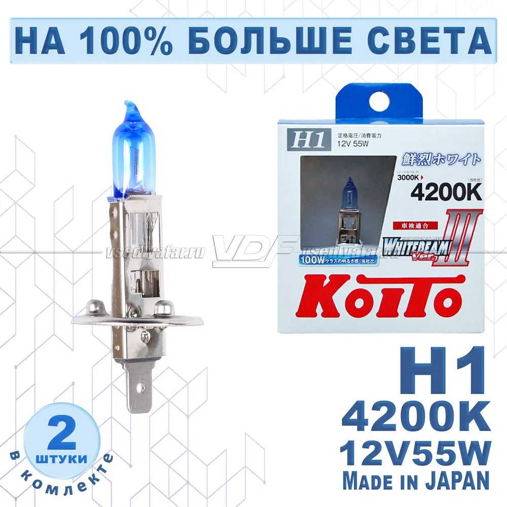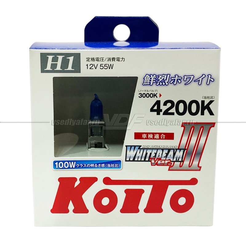 Лампа галогенная Koito Whitebeam H1 12V 55W (100W) 4200K (комплект 2 шт.)
