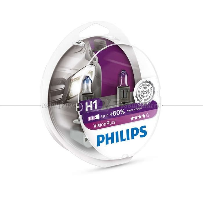 Лампа галогенная PHILIPS H1 Vision Plus 12V 55W, 2 шт, 12258VPS2