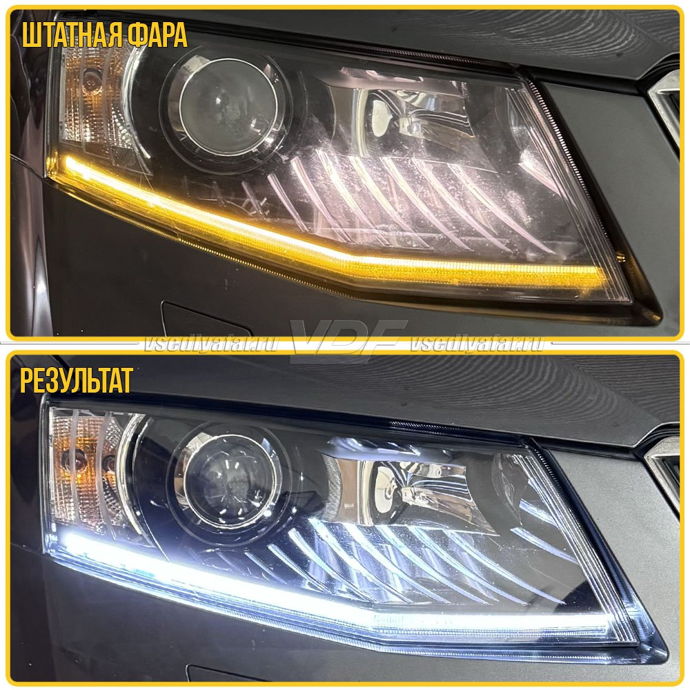 Плата отвечает за свечение световода (реснички) в фарах автомобиля Skoda Octavia A7 Это полноценное решение проблемы выхода из строя или тусклого свечения дневных ходовых огней (ДХО), вызванной перегревом и оплавлением штатного световода.