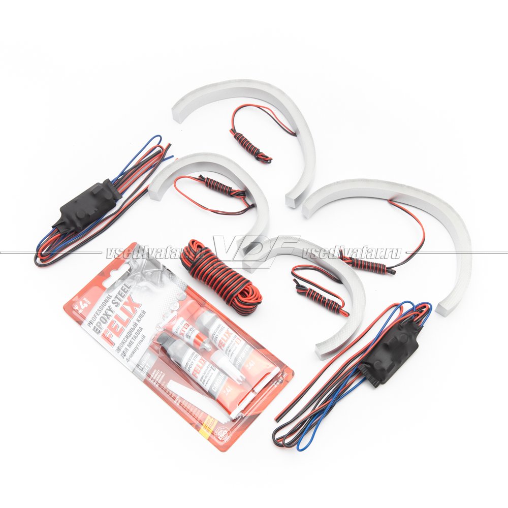 Красный толстый провод - Плюс (Общий) (подключение производится в зависимости от особенности автомобиля и может подключатся как внутри фары так и в блоке предохранителей на появляющийся плюс при включении зажигания.)