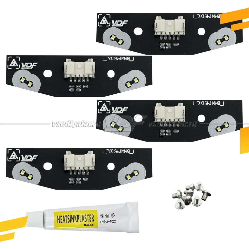 Комплектация: На 2 фары (4 штуки), теплопроводный клей, винты крепления.