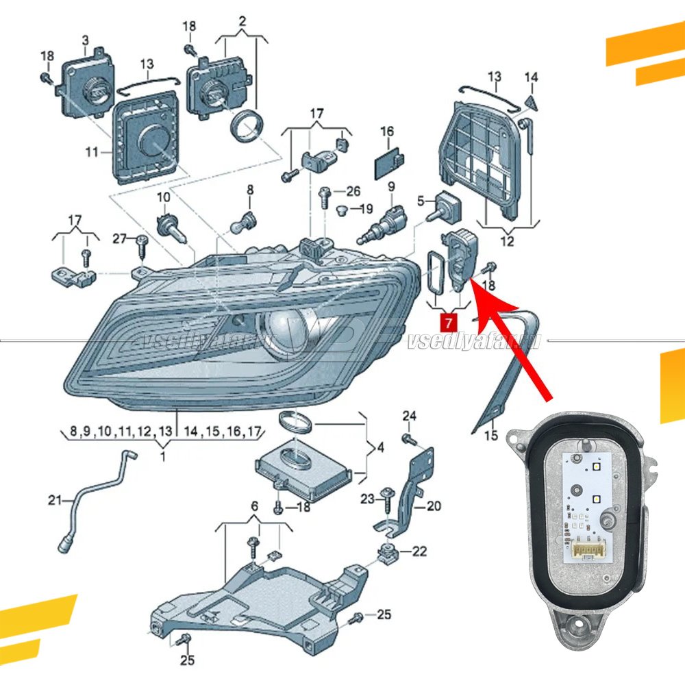В большем % случаев, проблема в оплавленном световоде замену которому также можно приобрести отдельно в нашем интернет магазине. Из-за вплавления светодиодов в световод светодиодные платы также выходят из строя и лучший вариант иметь их в запасе перед ремонтом фар.
