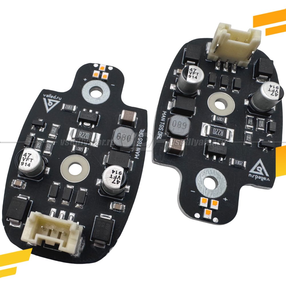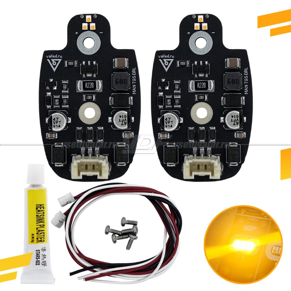 Комплект представляет из себя набор печатных плат для установки в фару MAN TG1 с 2007 по 2017 года выпуска. В комплекте есть всё необходимое для двух фар – платы ДХО, термопроводящий клей, проводка, набор новых винтиков нужной глубины. По посадочным местам подходит как на оригинальные радиаторы, так и на радиаторы Depo. Так же на некоторые «Китайские без бренда».