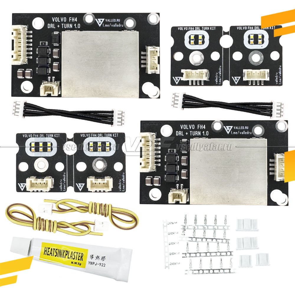 Комплект представляет из себя набор печатных плат для полноценного ремонта и «тюнинга» ДХО VOLVO FH4 всех годов выпуска. В комплекте есть всё необходимое для двух фар – платы драйверов, перемычки, провода подключения поворотника, набор пинов и коннекторов для ремонта подгоревшей проводки или переделки «Китайской» проводки в оригинал. По посадочным местам подходит как на оригинальные радиаторы, так и на радиаторы Depo. Так же на некоторые «Китайские без бренда».