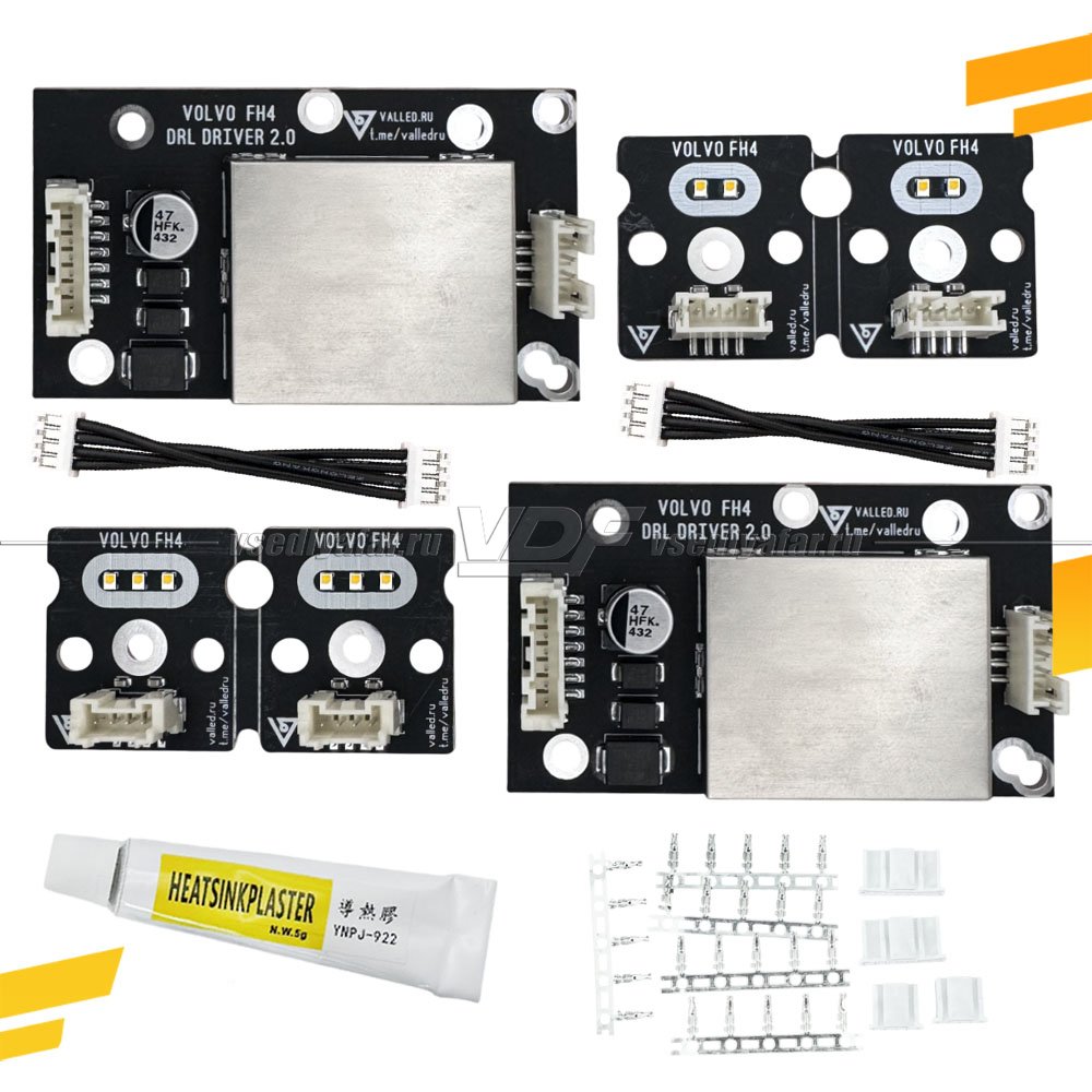 Комплект представляет из себя набор печатных плат для полноценного ремонта ДХО VOLVO FH4 всех годов выпуска. В комплекте есть всё необходимое для двух фар – платы драйверов, перемычки, набор пинов и коннекторов для ремонта подгоревшей проводки или переделки «Китайской» проводки в оригинал. По посадочным местам подходит как на оригинальные радиаторы, так и на радиаторы Depo. Так же на некоторые «Китайские без бренда».