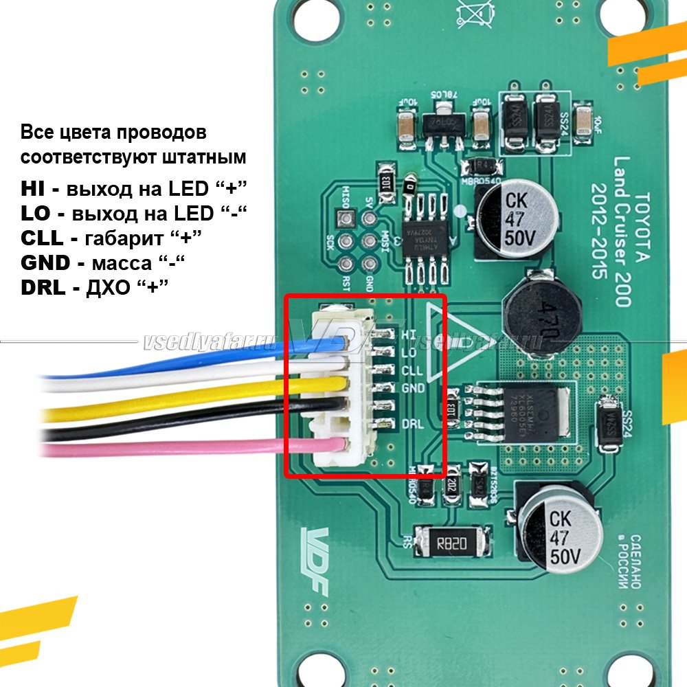 Драйвер управления штатными дневными ходовыми огнями (ДХО) для Toyota Land Cruiser 200 (J200), выпуск которого начался с апреля 2012 года по декабрь 2015 года (рестайлинговая версия 11-го поколения). Этот продукт разработан компанией VDF-Light специально для решения проблем, связанных с работой ДХО, таких как их отключение или мигание.