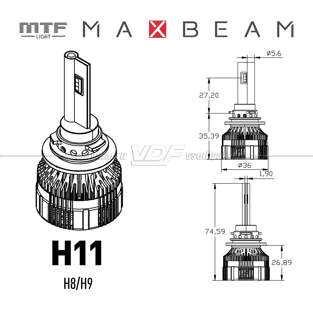 Светодиодные лампы MTF Light MaxBeam H11/H9 6000K 12V, 55W, 2шт, MB11K6